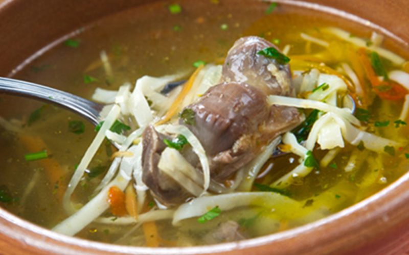 Vezi articolulIngrediente: • 6 pahare apă, • 500-700 g măruntaie de pasare, • 1 ½ tăiței